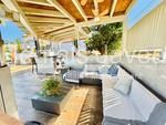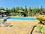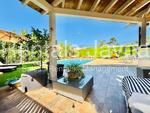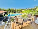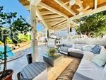 Una terraza cubierta junto al salón ofrece vistas a la piscina privada, creando un espacio encantador para relajarse y disfrutar del entorno.