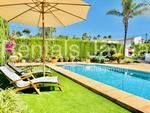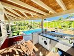 En el exterior, la villa cuenta con un bonito jardín y una cocina exterior, ideal para disfrutar al aire libre.